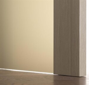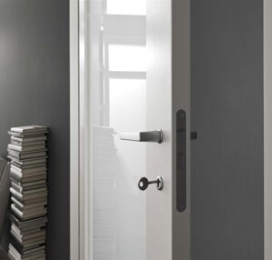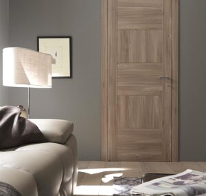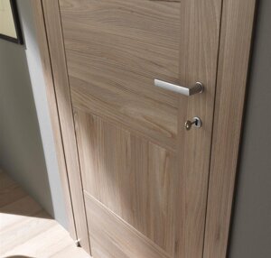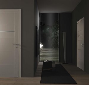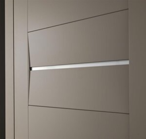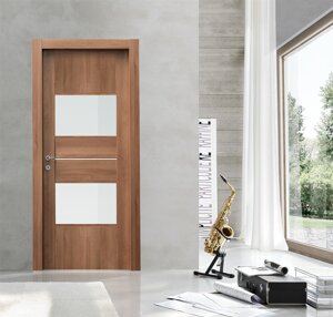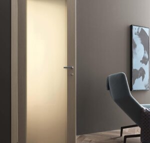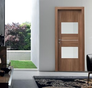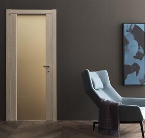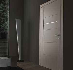 Design sofisticato per queste porte dalla visione contemporanea, gioco di superfici e finiture, vetri incastonati, gioco di luci.